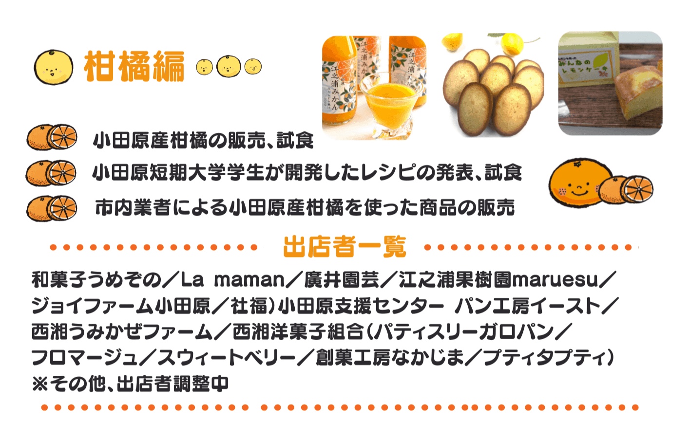 和菓子うめぞの/La maman/廣井園芸/江之浦果樹園maruesu/ジョイファーム小田原/社福)小田原支援センター パン工房イースト/ 西湘うみかぜファーム/西湘洋菓子組合(パティスリーガロパン/フロマージュ/スウィートベリー/創菓工房なかじま/プティタプティ)