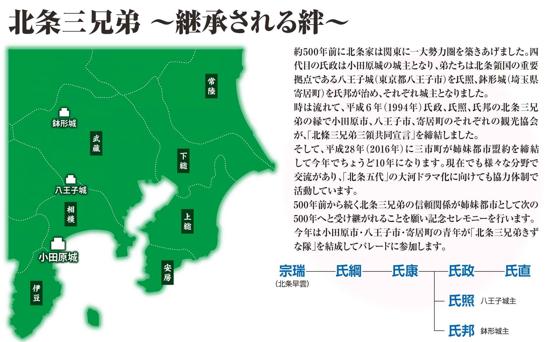 そして、時は流れ、三兄弟が居城を構えた小田原市・八王子市、寄居町は平成28年に姉妹都市盟約を締結しました。これまで様々な分野で交流が行われており、今年で10周年となりました。豊臣兄弟に負けないような、10周年を記念した特別企画を行います。